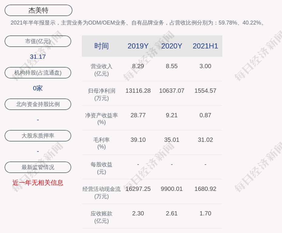 2021年半年报显示,杰美特的主营业务为ODM/OEM业务、自有品牌业务,占营收比例分别为:59.78%、40.22%。