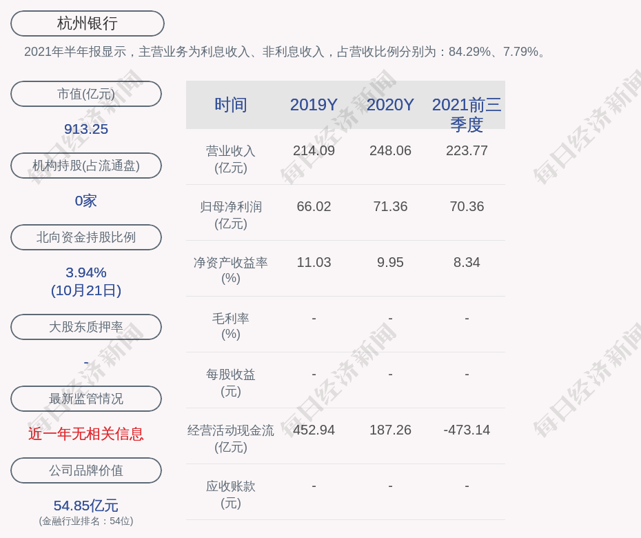 2021年半年报显示,杭州银行的主营业务为利息收入、非利息收入,占营收比例分别为:84.29%、7.79%。