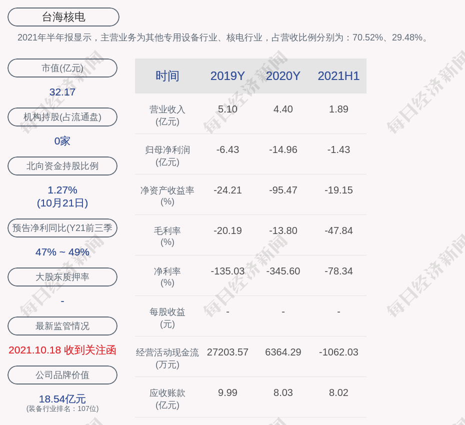 2021年半年报显示,台海核电的主营业务为其他专用设备行业、核电行业,占营收比例分别为:70.52%、29.48%。