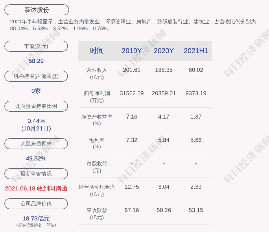 2021年半年报显示,泰达股份的主营业务为批发业、环境管理业、房地产、纺织服装行业、建筑业,占营收比例分别为:88.04%、6.53%、3.52%、1.06%、0.75%。