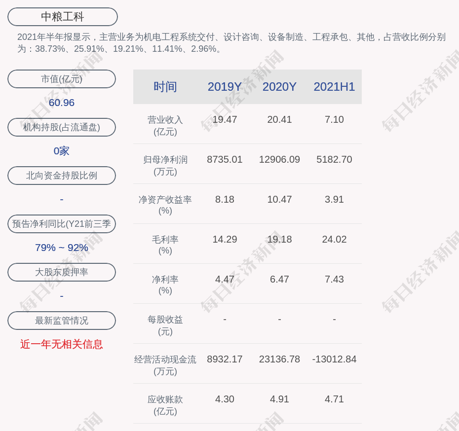 2021年半年报显示,中粮工科的主营业务为机电工程系统交付、设计咨询、设备制造、工程承包、其他,占营收比例分别为:38.73%、25.91%、19.21%、11.41%、2.96%。