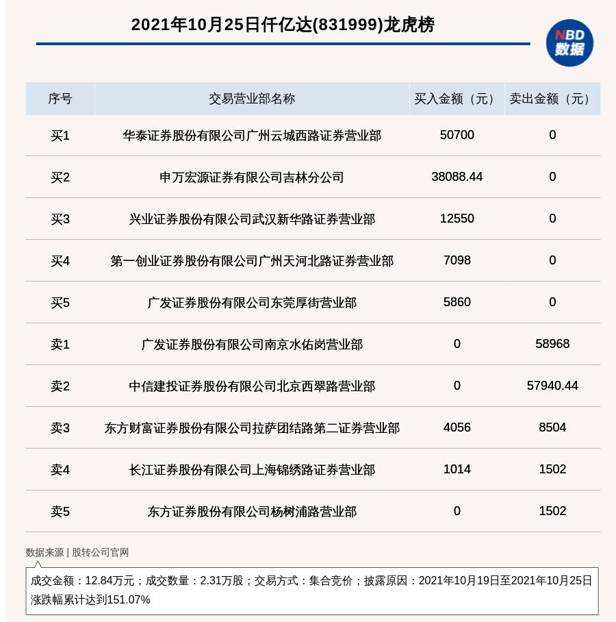每经AI快讯,2021年10月25日,仟亿达(831999)登上龙虎榜,交易方式是集合竞价,披露原因是2021年10月19日至2021年10月25日涨跌幅累计达到151.07%,成交数量2.31万股,成交金额12.84万元。买一席位为华泰证券股份有限公司广州云城西路证券营业部,买入5.07万元;卖一席位为广发证券股份有限公司南京水佑岗营业部,卖出5.90万元。