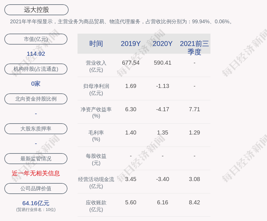 2021年半年报显示,远大控股的主营业务为商品贸易、物流代理服务,占营收比例分别为:99.94%、0.06%。