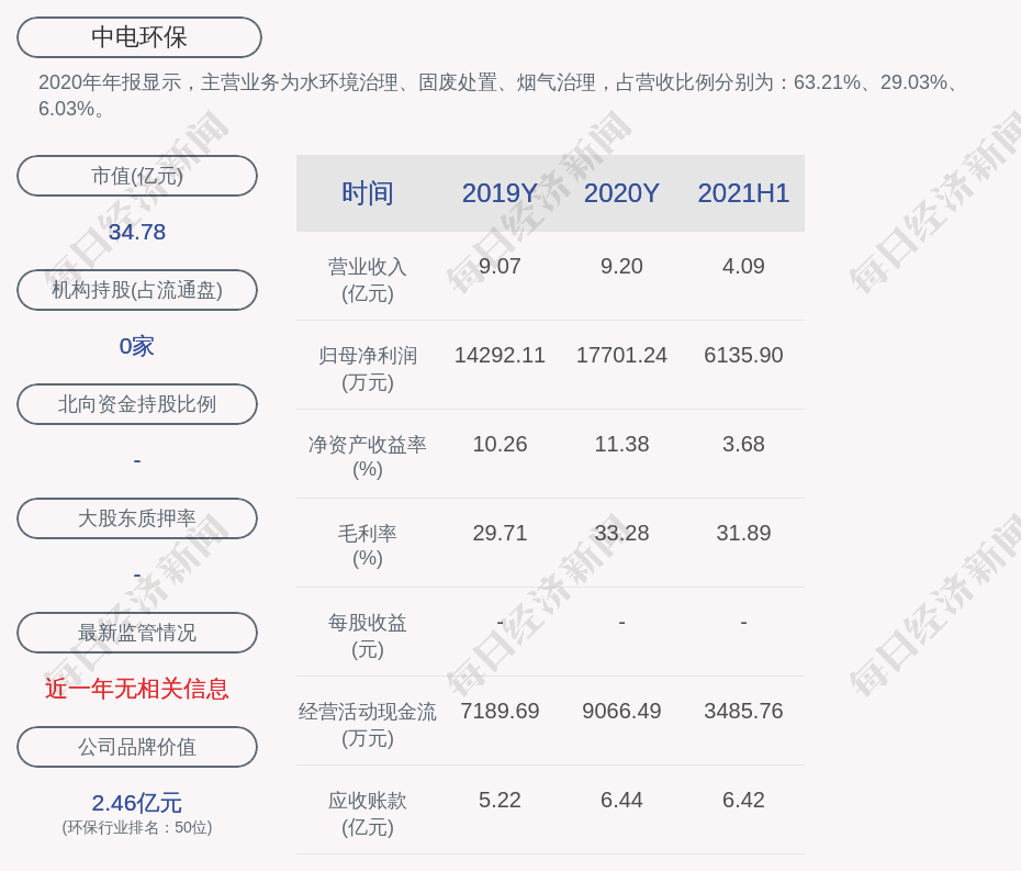 2020年年报显示,中电环保的主营业务为水环境治理、固废处置、烟气治理,占营收比例分别为:63.21%、29.03%、6.03%。