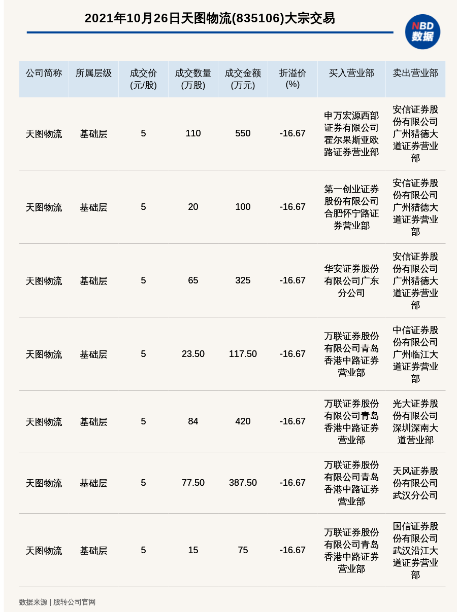 每经AI快讯,2021年10月26日,新三板基础层公司天图物流(835106)发生7笔大宗交易,总成交金额为1975万元,成交金额最高的一笔成交价5元/股,成交数量110万股,成交金额550万元,折价16.67%。买入营业部是申万宏源西部证券有限公司霍尔果斯亚欧路证券营业部,卖出营业部是安信证券股份有限公司广州猎德大道证券营业部。