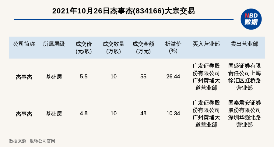 每经AI快讯,2021年10月26日,新三板基础层公司杰事杰(834166)发生2笔大宗交易,溢价率最高的一笔成交价5.5元/股,成交数量10万股,成交金额55万元,溢价26.44%。买入营业部是广发证券股份有限公司广州黄埔大道营业部,卖出营业部是国盛证券有限责任公司上海徐汇区虹桥路营业部。