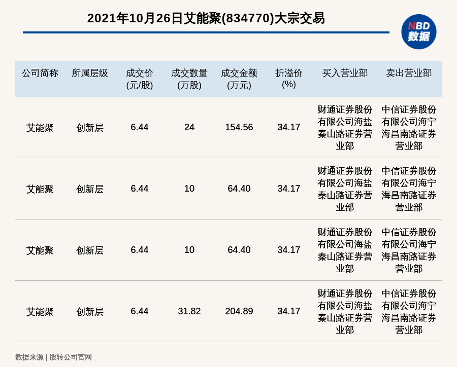 每经AI快讯,2021年10月26日,新三板创新层公司艾能聚(834770)发生4笔大宗交易,溢价率最高的一笔成交价6.44元/股,成交数量24万股,成交金额154.56万元,溢价34.17%。买入营业部是财通证券股份有限公司海盐秦山路证券营业部,卖出营业部是中信证券股份有限公司海宁海昌南路证券营业部。