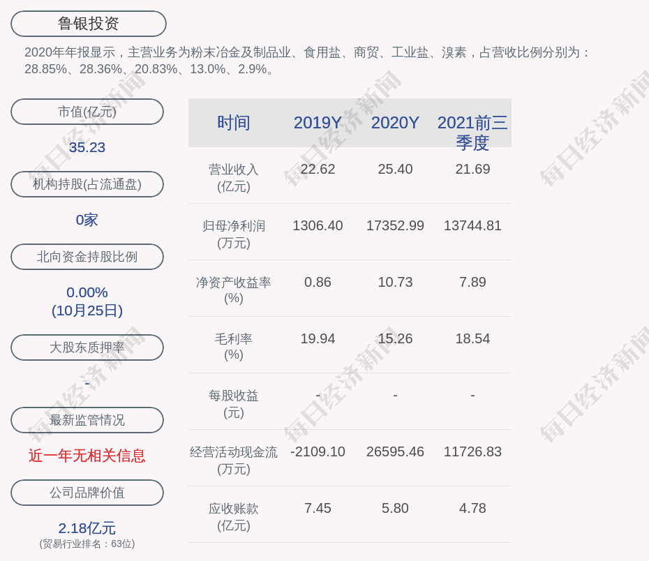 2020年年报显示,鲁银投资的主营业务为粉末冶金及制品业、食用盐、商贸、工业盐、溴素,占营收比例分别为:28.85%、28.36%、20.83%、13.0%、2.9%。