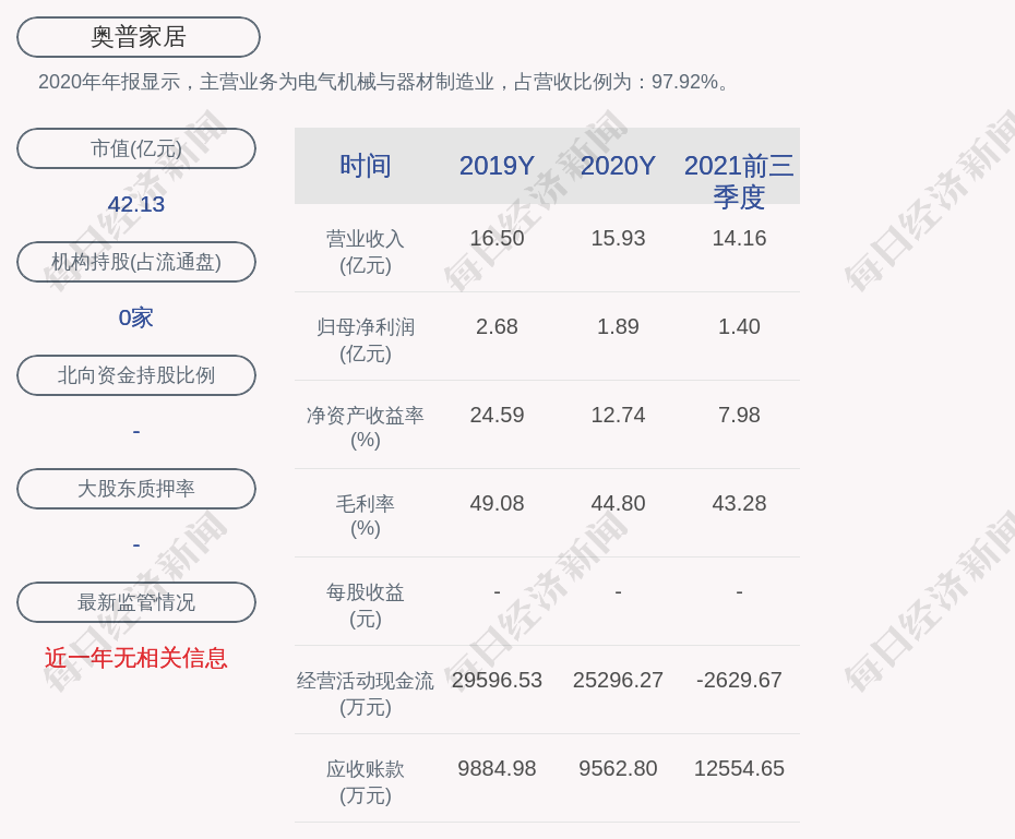 2020年年报显示,奥普家居的主营业务为电气机械与器材制造业,占营收比例为:97.92%。
