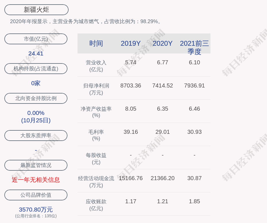 2020年年报显示,新疆火炬的主营业务为城市燃气,占营收比例为:98.29%。