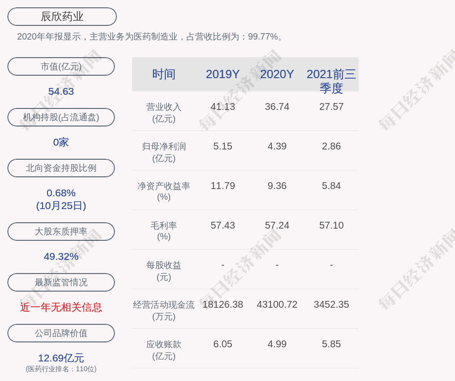 2020年年报显示,辰欣药业的主营业务为医药制造业,占营收比例为:99.77%。