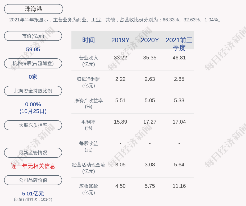 2021年半年报显示,珠海港的主营业务为商业、工业、其他,占营收比例分别为:66.33%、32.63%、1.04%。