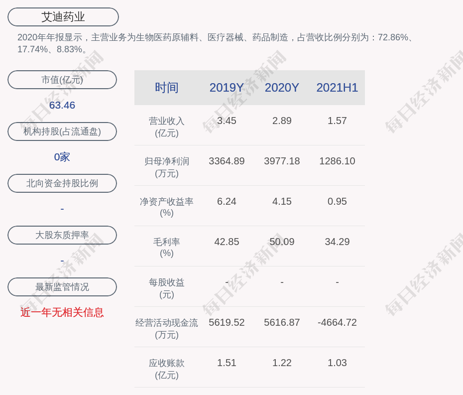 2020年年报显示,艾迪药业的主营业务为生物医药原辅料、医疗器械、药品制造,占营收比例分别为:72.86%、17.74%、8.83%。
