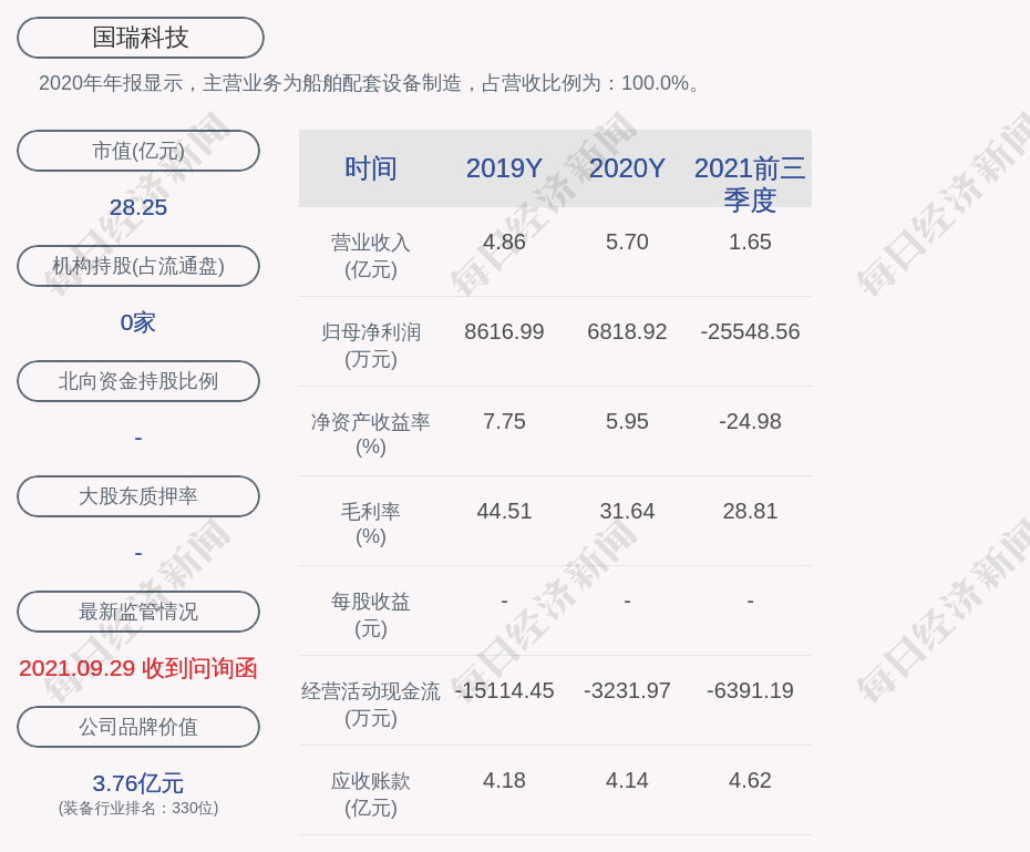 2020年年报显示,国瑞科技的主营业务为船舶配套设备制造,占营收比例为:100.0%。