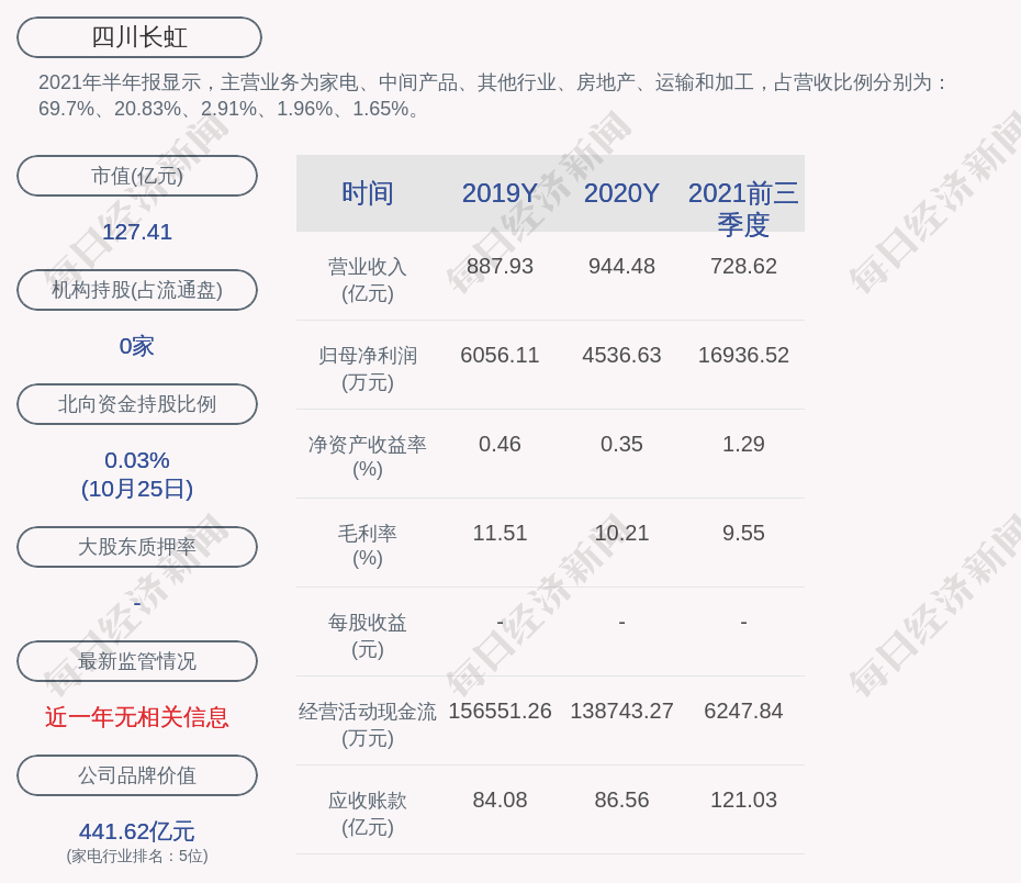 2021年半年报显示,四川长虹的主营业务为家电、中间产品、其他行业、房地产、运输和加工,占营收比例分别为:69.7%、20.83%、2.91%、1.96%、1.65%。