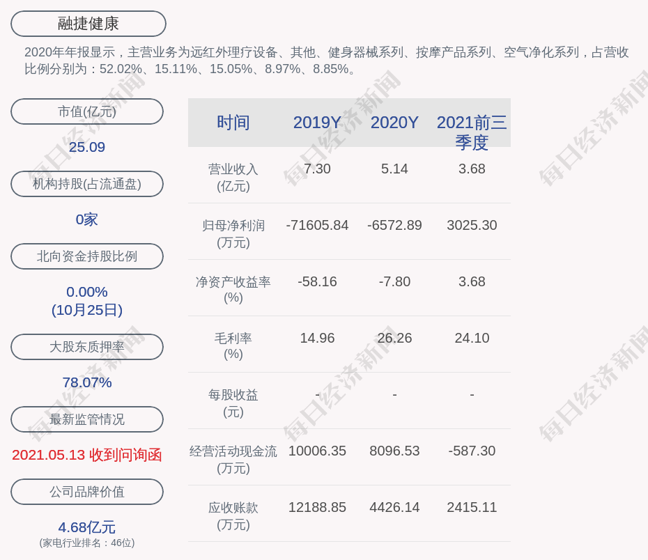 2020年年报显示,融捷健康的主营业务为远红外理疗设备、其他、健身器械系列、按摩产品系列、空气净化系列,占营收比例分别为:52.02%、15.11%、15.05%、8.97%、8.85%。