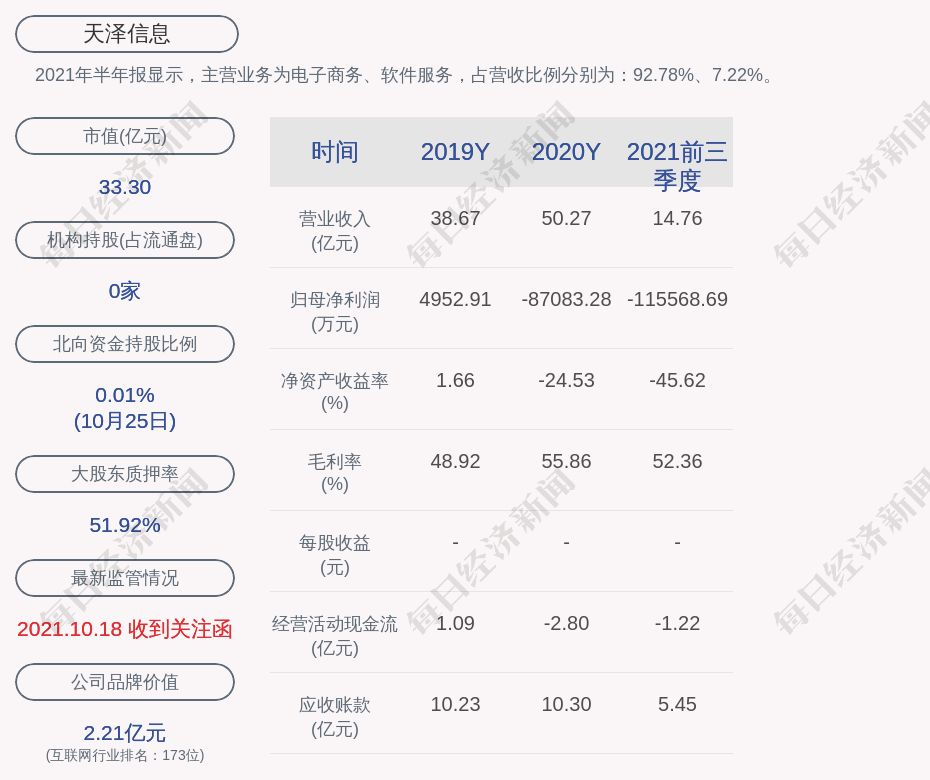 2021年半年报显示,天泽信息的主营业务为电子商务、软件服务,占营收比例分别为:92.78%、7.22%。