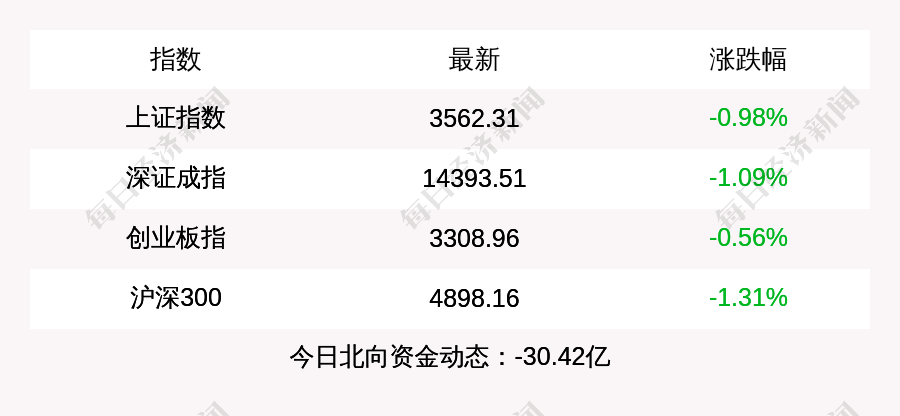 每经AI快讯:北京时间10月27日15:00,上证指数收盘下跌35.33点,跌幅为0.98%,报收3562.31点,成交额4707.78亿元;深证成指收盘下跌159.31点,跌幅为1.09%,报收14393.51点,成交额6060.5亿元;创业板指收盘下跌18.58点,跌幅为0.56%,报收3308.96点,成交额2277.24亿元;沪深300收盘下跌64.94点,跌幅为1.31%,报收4898.16点,成交额2994.6亿元。北上资金当日净流出30.42亿元。