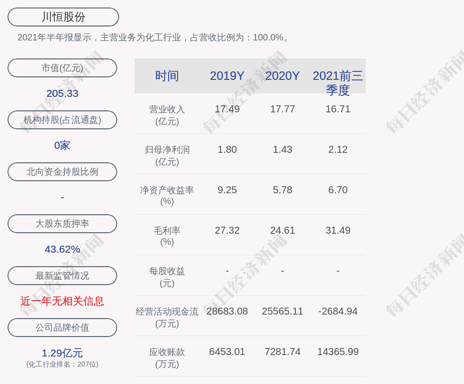 2021年半年报显示,川恒股份的主营业务为化工行业,占营收比例为:100.0%。