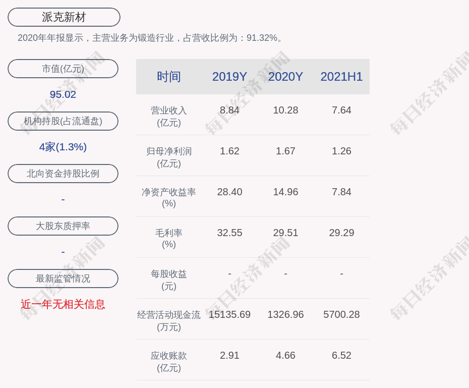 2020年年报显示,派克新材的主营业务为锻造行业,占营收比例为:91.32%。