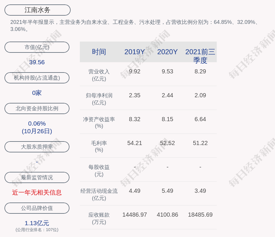 2021年半年报显示,江南水务的主营业务为自来水业、工程业务、污水处理,占营收比例分别为:64.85%、32.09%、3.06%。