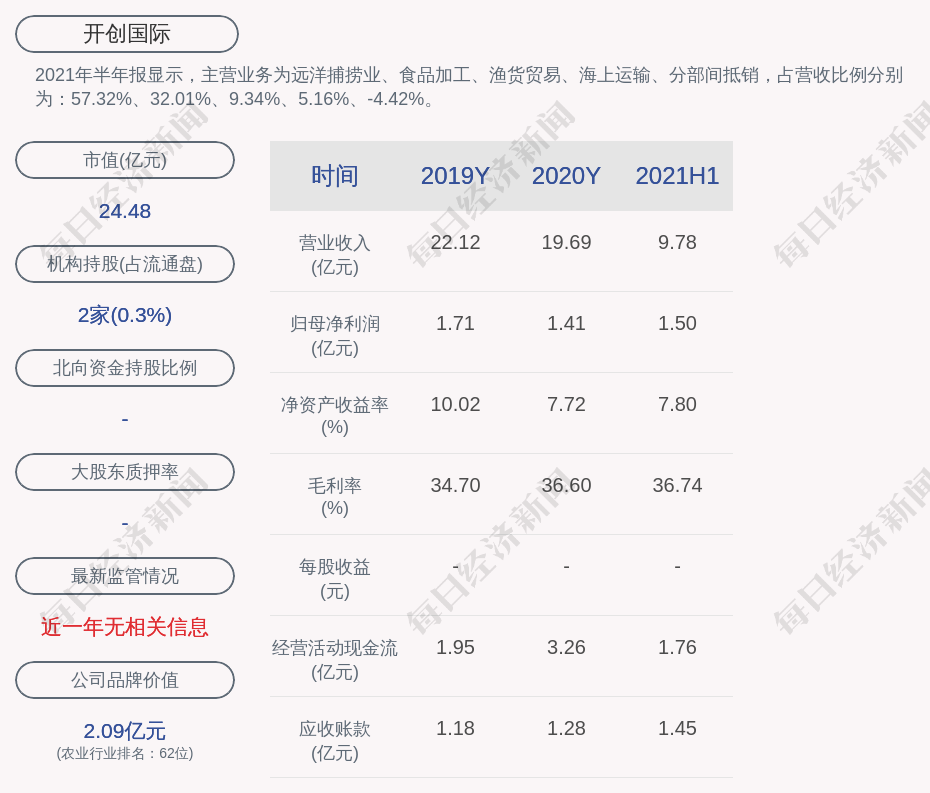 2021年半年报显示,开创国际的主营业务为远洋捕捞业、食品加工、渔货贸易、海上运输、分部间抵销,占营收比例分别为:57.32%、32.01%、9.34%、5.16%、-4.42%。