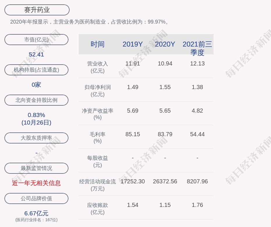 2020年年报显示,赛升药业的主营业务为医药制造业,占营收比例为:99.97%。