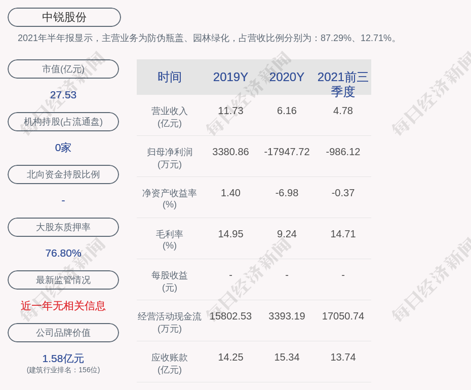 2021年半年报显示,中锐股份的主营业务为防伪瓶盖、园林绿化,占营收比例分别为:87.29%、12.71%。