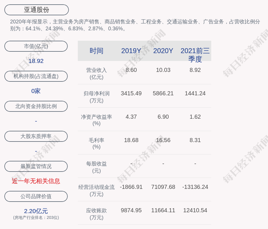 2020年年报显示,亚通股份的主营业务为房产销售、商品销售业务、工程业务、交通运输业务、广告业务,占营收比例分别为:64.1%、24.39%、6.83%、2.87%、0.36%。