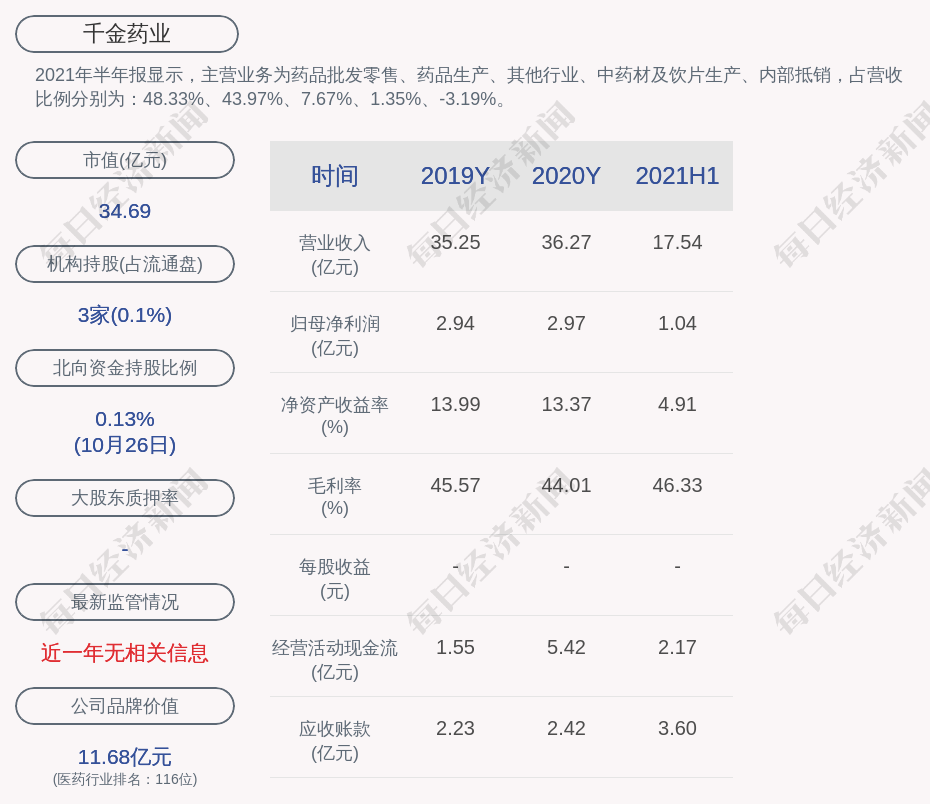2021年半年报显示,千金药业的主营业务为药品批发零售、药品生产、其他行业、中药材及饮片生产、内部抵销,占营收比例分别为:48.33%、43.97%、7.67%、1.35%、-3.19%。