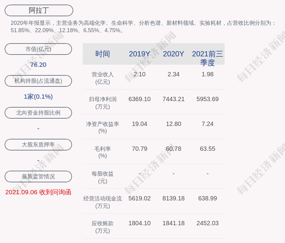 2020年年报显示,阿拉丁的主营业务为高端化学、生命科学、分析色谱、新材料领域、实验耗材,占营收比例分别为:51.85%、22.09%、12.18%、6.55%、4.75%。