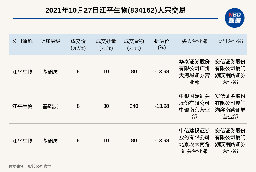 每经AI快讯,2021年10月27日,新三板基础层公司江平生物(834162)发生3笔大宗交易,总成交金额为400万元,成交金额最高的一笔成交价8元/股,成交数量30万股,成交金额240万元,折价13.98%。买入营业部是中银国际证券股份有限公司中银南京营业部,卖出营业部是安信证券股份有限公司厦门湖滨南路证券营业部。