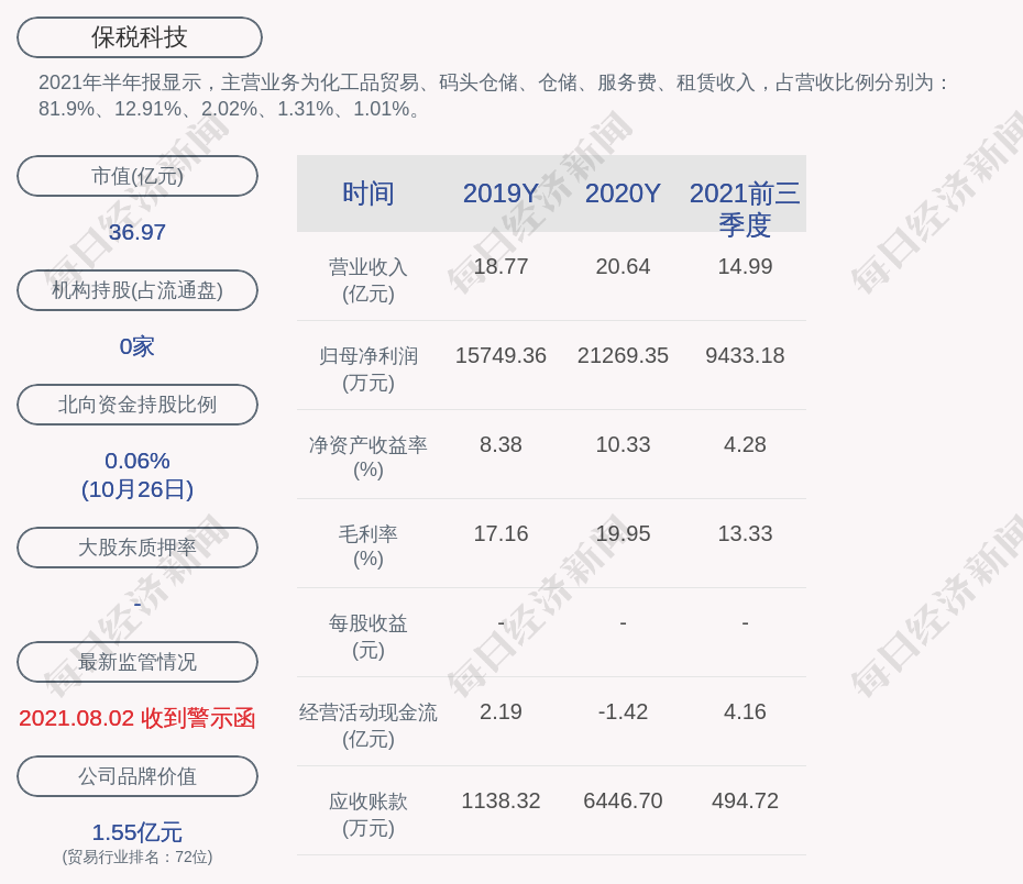 2021年半年报显示,保税科技的主营业务为化工品贸易、码头仓储、仓储、服务费、租赁收入,占营收比例分别为:81.9%、12.91%、2.02%、1.31%、1.01%。