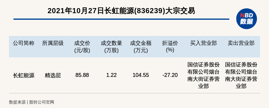 每经AI快讯,2021年10月27日,新三板精选层公司长虹能源(836239)发生一笔大宗交易,成交价85.88元/股,成交数量1.22万股,成交金额104.55万元,折价27.2%。买入营业部是国信证券股份有限公司烟台南大街证券营业部,卖出营业部是国信证券股份有限公司烟台南大街证券营业部。
