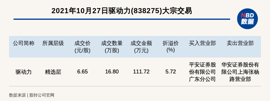 每经AI快讯,2021年10月27日,新三板精选层公司驱动力(838275)发生一笔大宗交易,成交价6.65元/股,成交数量16.80万股,成交金额111.72万元,溢价5.72%。买入营业部是平安证券股份有限公司广东分公司,卖出营业部是华安证券股份有限公司上海张杨路营业部。