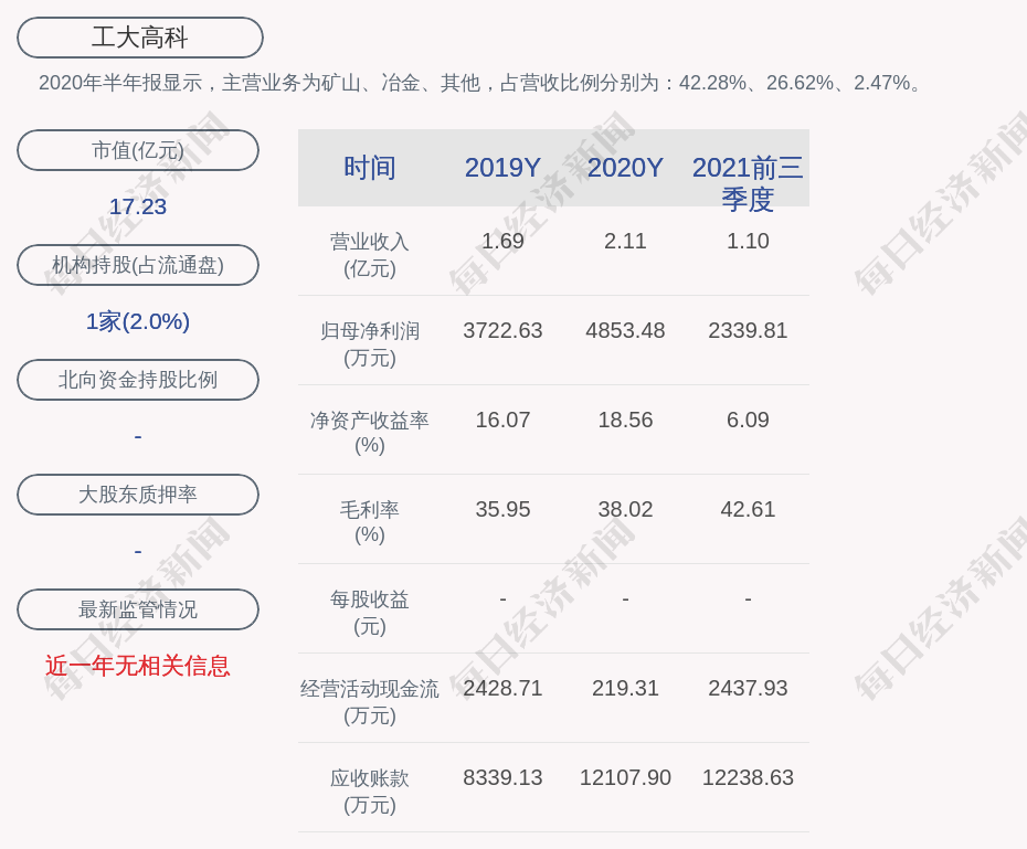 2020年半年报显示,工大高科的主营业务为矿山、冶金、其他,占营收比例分别为:42.28%、26.62%、2.47%。