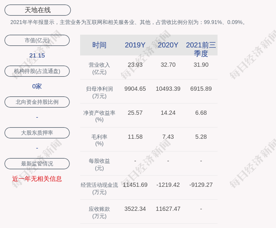 2021年半年报显示,天地在线的主营业务为互联网和相关服务业、其他,占营收比例分别为:99.91%、0.09%。