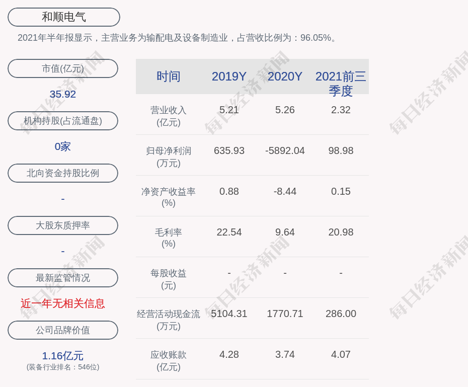 2021年半年报显示,和顺电气的主营业务为输配电及设备制造业,占营收比例为:96.05%。