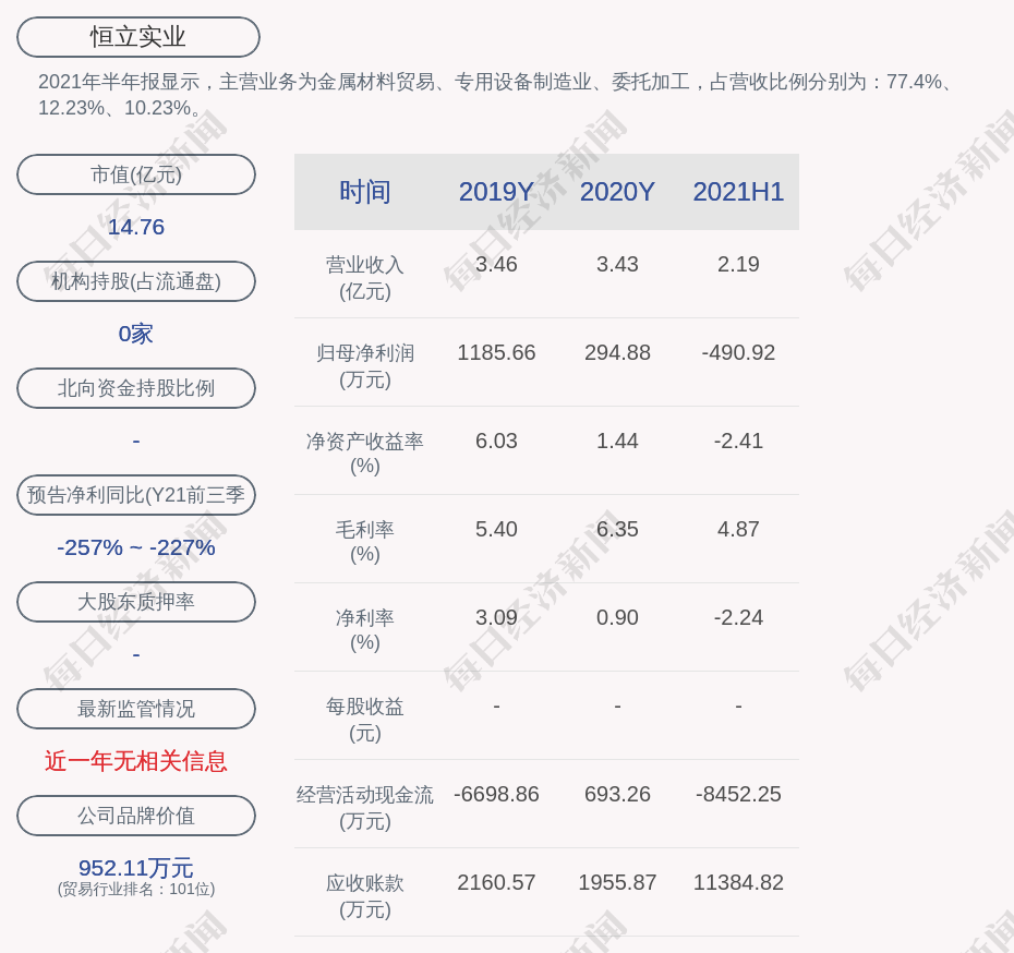 2021年半年报显示,恒立实业的主营业务为金属材料贸易、专用设备制造业、委托加工,占营收比例分别为:77.4%、12.23%、10.23%。