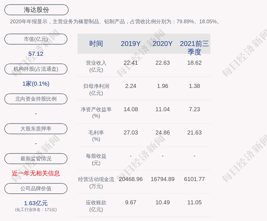 2020年年报显示,海达股份的主营业务为橡塑制品、铝制产品,占营收比例分别为:79.89%、18.05%。