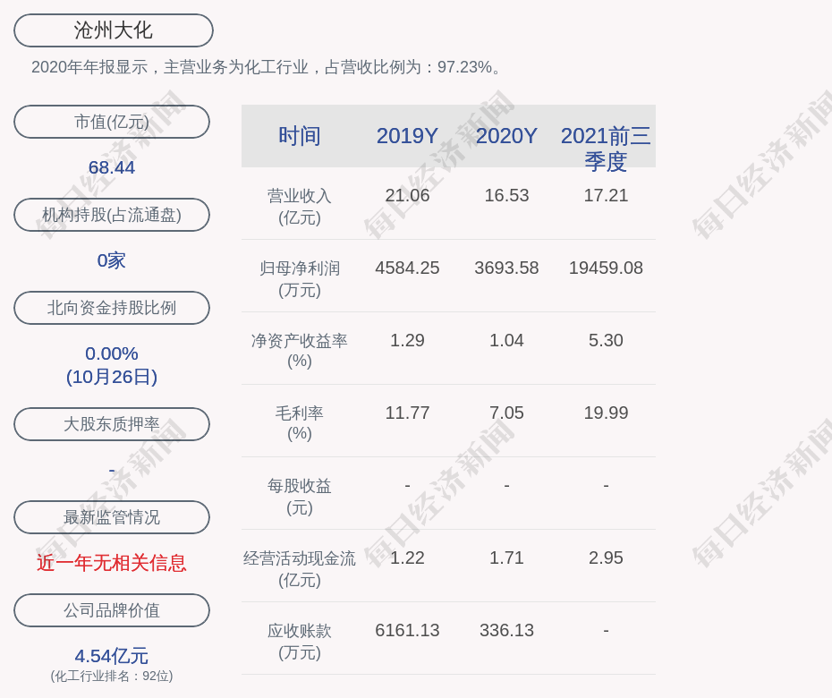 2020年年报显示,沧州大化的主营业务为化工行业,占营收比例为:97.23%。
