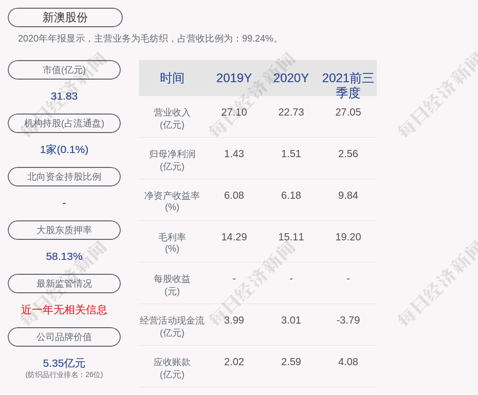 2020年年报显示,新澳股份的主营业务为毛纺织,占营收比例为:99.24%。