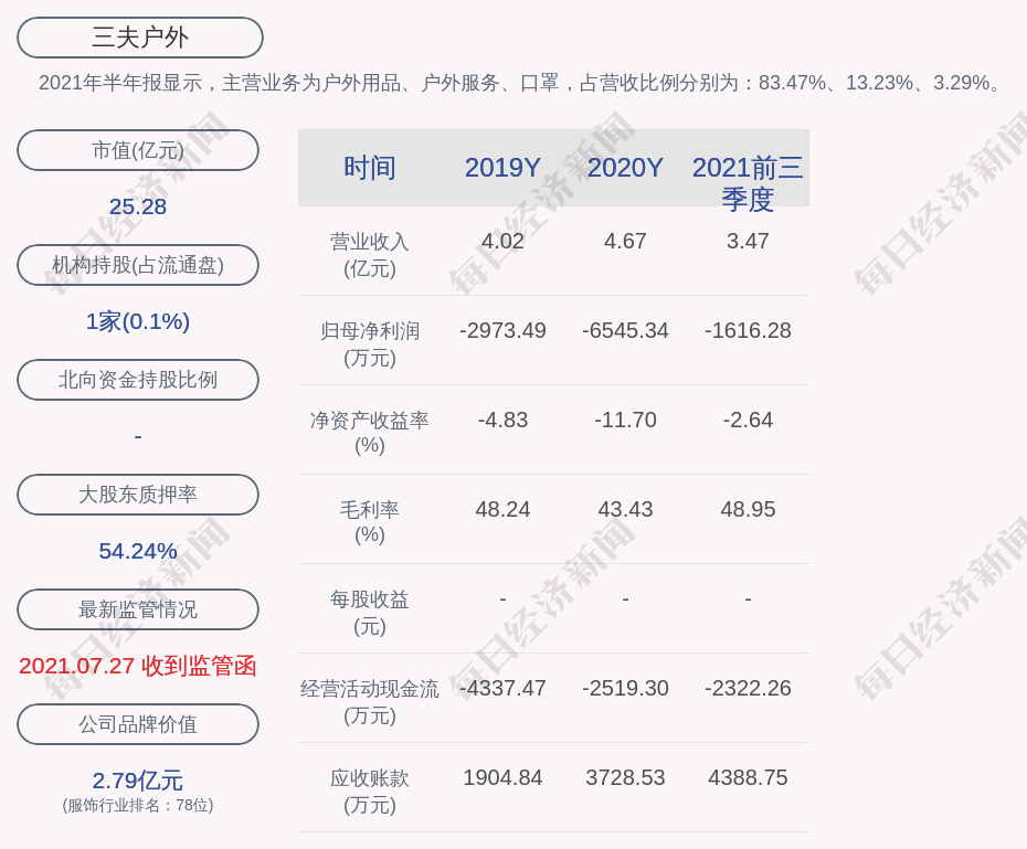 2021年半年报显示,三夫户外的主营业务为户外用品、户外服务、口罩,占营收比例分别为:83.47%、13.23%、3.29%。