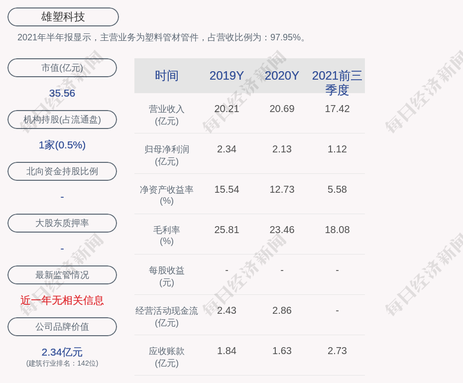 2021年半年报显示,雄塑科技的主营业务为塑料管材管件,占营收比例为:97.95%。