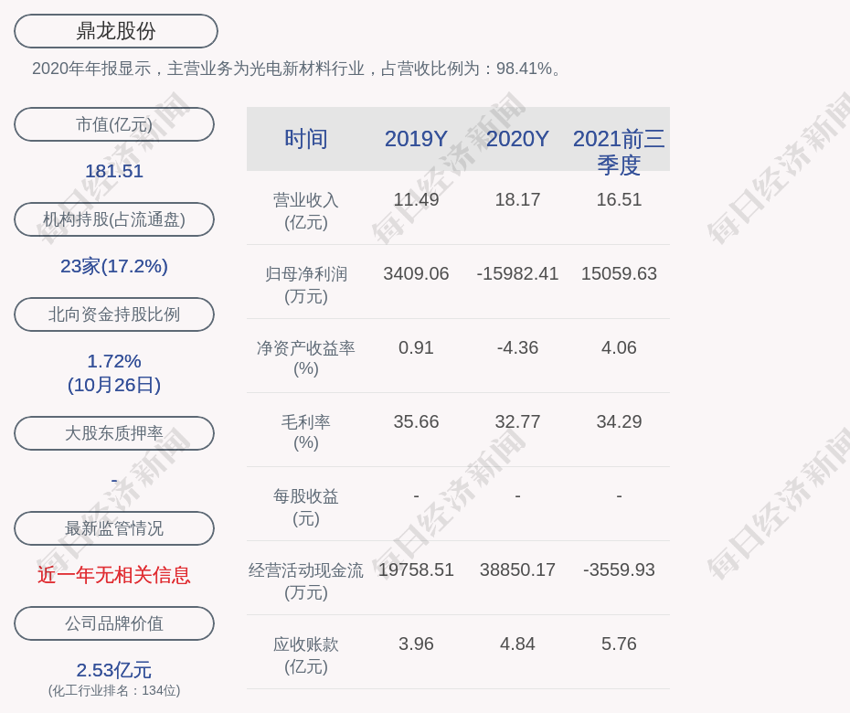 2020年年报显示,鼎龙股份的主营业务为光电新材料行业,占营收比例为:98.41%。