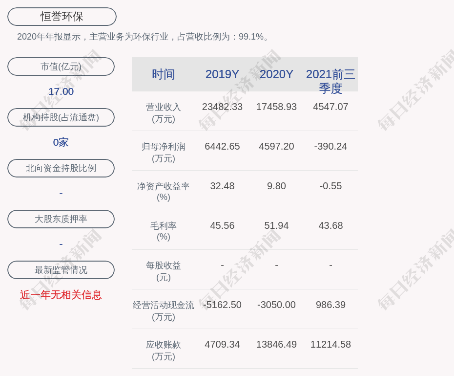 2020年年报显示,恒誉环保的主营业务为环保行业,占营收比例为:99.1%。