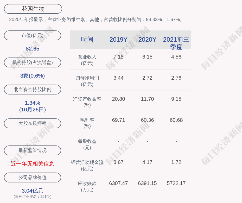 2020年年报显示,花园生物的主营业务为维生素、其他,占营收比例分别为:98.33%、1.67%。