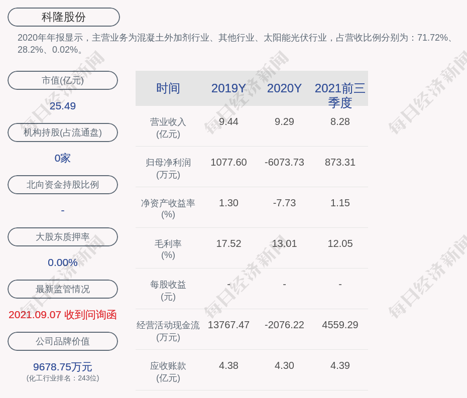 2020年年报显示,科隆股份的主营业务为混凝土外加剂行业、其他行业、太阳能光伏行业,占营收比例分别为:71.72%、28.2%、0.02%。