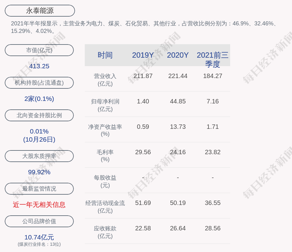 2021年半年报显示,永泰能源的主营业务为电力、煤炭、石化贸易、其他行业,占营收比例分别为:46.9%、32.46%、15.29%、4.02%。