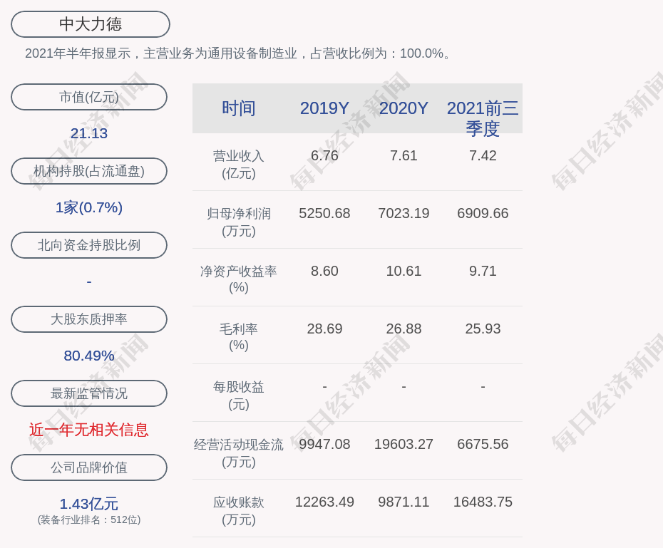2021年半年报显示,中大力德的主营业务为通用设备制造业,占营收比例为:100.0%。